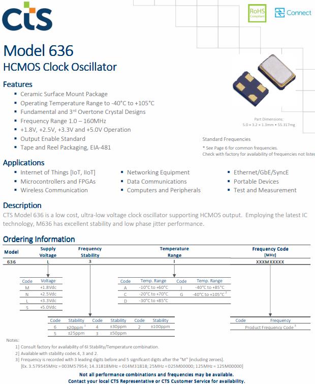 更多>>CTS編碼636L3I027M00000是一款低電壓時(shí)鐘振蕩器支持HCMOS輸出