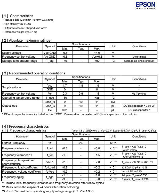 | X1G004131003416 | TG-5006CJ | 26.000000 MHz | 2.00 x 1.60 x 0.73 mm | 1.700 to 1.900 V | +/-1.5 ppm | -30 to +85 °C | +/-2.00 ppm |