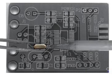 焊接和清除多余會造成短路的焊錫之后,石英晶體諧振器基本上就算是焊接好了.但是由于使用松香助焊和吸錫帶吸錫的緣故,致使電路板上的晶振腳位的周圍殘留了一些松香,雖然并不影響晶振的工作和正常使用,但也不是太美觀.而且有可能造成檢查時不方便.因此有必要對這些殘余物進行清理.常用的清理方法可以用洗板水,在這里,采用了酒精清洗,清洗工具可以用棉簽,也可以用鑷子夾著衛(wèi)生紙之類進行.清洗擦除時應該注意的是酒精要適量,其濃度最好較高,以快速溶解松香之類的殘留物.其次,擦除的力道要控制好,不能太大,以免擦傷晶振焊接部分.此時可以用烙鐵或者熱風槍對酒精擦洗位置進行適當加熱以讓殘余酒精快速揮發(fā).至此,石英晶振的焊接程序就算是結束了.